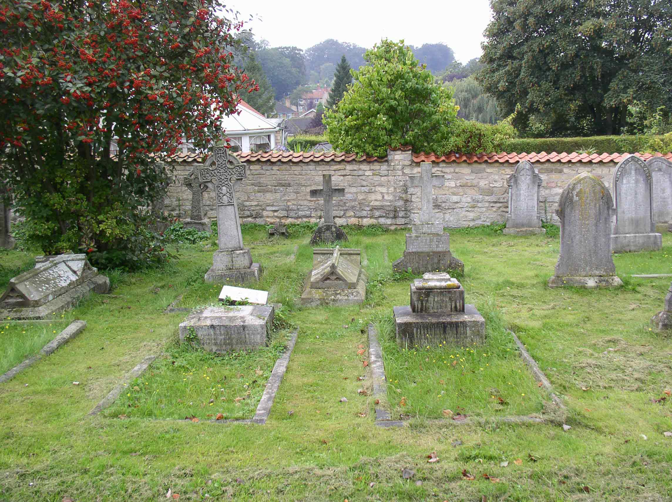 This is a photo of the Branston graves of the second Rev Peregrine Curtois, his wife, and some of their family. The two white ones in the foreground are Rev Peregrine Curtois (left), and his wife Mary (right); when I was little, both had big white crosses on the top (you can see where the one on the left has come off). The three behind them are Chauncy Curtois, John Curtois, and Mary Hayter (nee Curtois), and behind them are ?, ? and ? (I can't remember - I promise to go and look the next time I'm there). There are a couple of small ones at the back, which are two of Arthur Curtois' children who died in infancy, and to the left of those (behind the bush) are