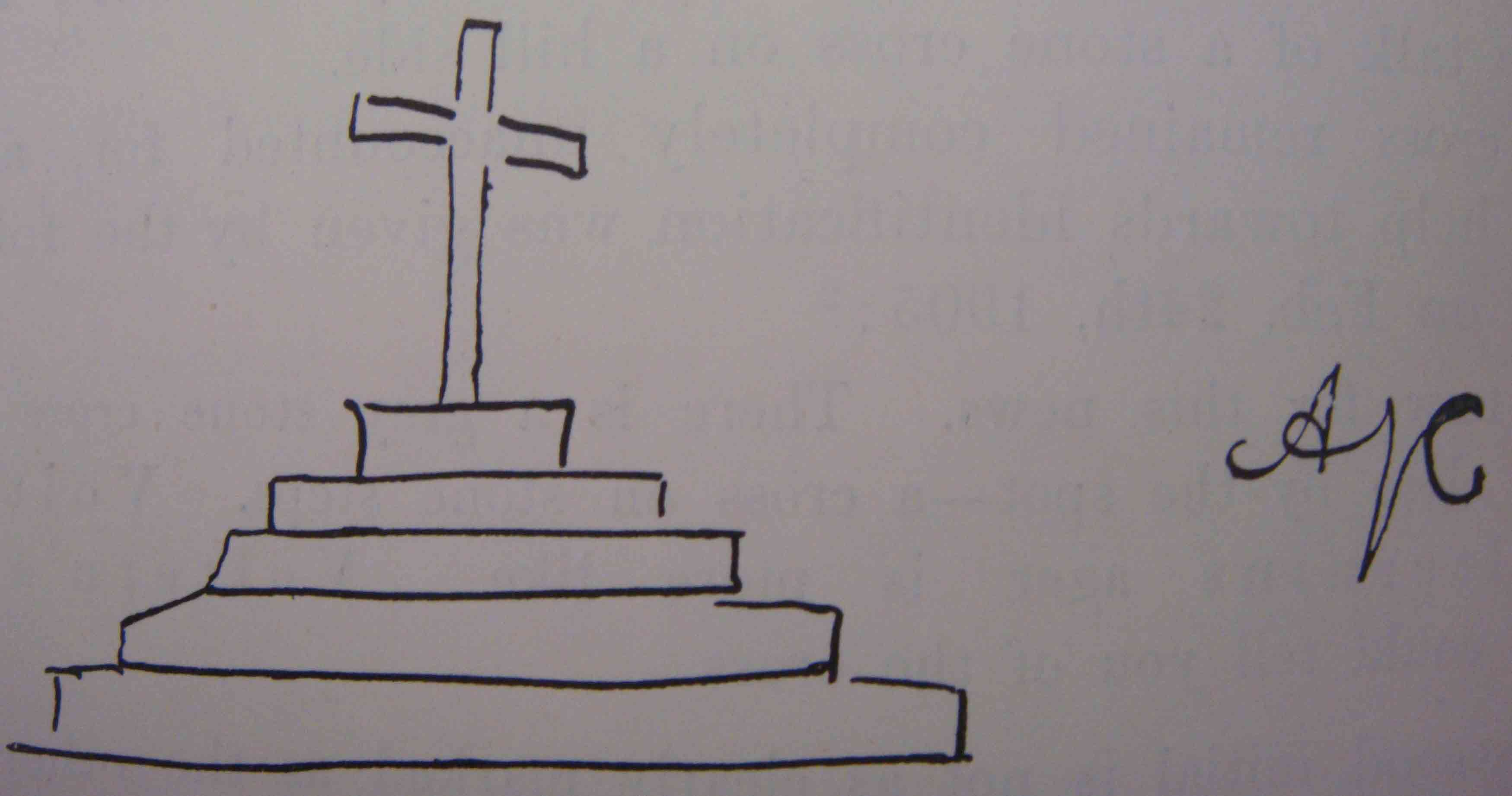This revived my interest in the original unidentified cross on five stone steps, and led me to look out for any possible means of verifying the statements of the script. The description has always puzzled me as it seems to imply two inconsistent things, (a) an old heroic deed and (b) a modern memorial, suggested by the fresh green wreath and the initials A. J. C. The second of these inititals, as I noted at the time, was by no means as distinct as the first and third. Facsimiles are given below of the cross drawn in the script and the initials: